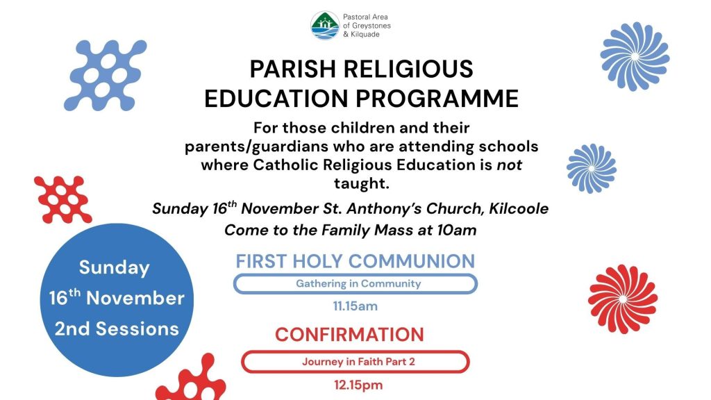 All sessions take place in St. Anthony’s Church, Kilcoole, following the 10am Family Mass, to which you are all warmly invited.
