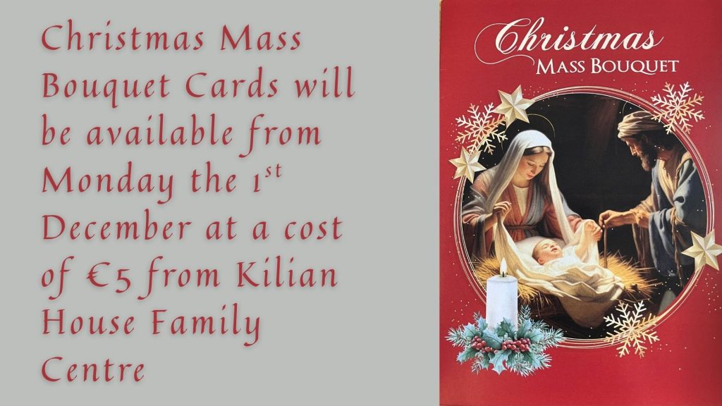 Christmas Mass Bouquet cards will be available from Monday the 1st December from Kilian House Family Centre in Greystones.