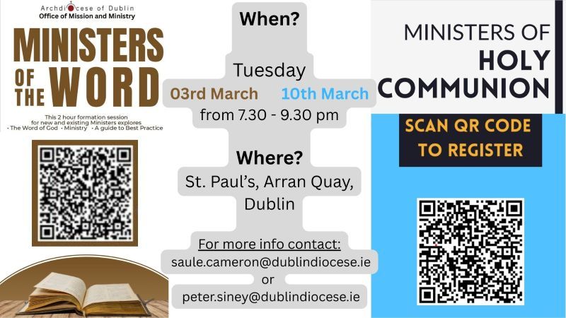 Ministers of the Word will gather in St Paul’s, Arran Quay, on March 3 from 7.30-9.30pm (with refreshments available from 7pm). To reserve your place please book online by scanning the QR code on the poster attached or using this link.