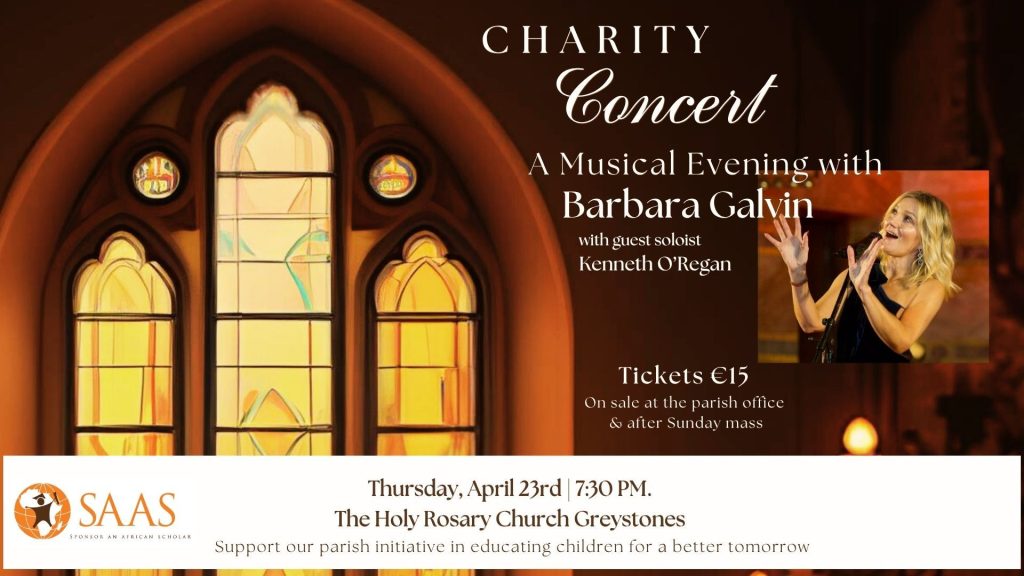 A Concert featuring Barbara Galvin supported by Kenneth O’Regan will take place in Holy Rosary Church Greystones on Thursday 23rd April at7.30p.m. This is in aid of SAAS – Sponsor An African Scholar – a Pastoral Area outreach initiative.