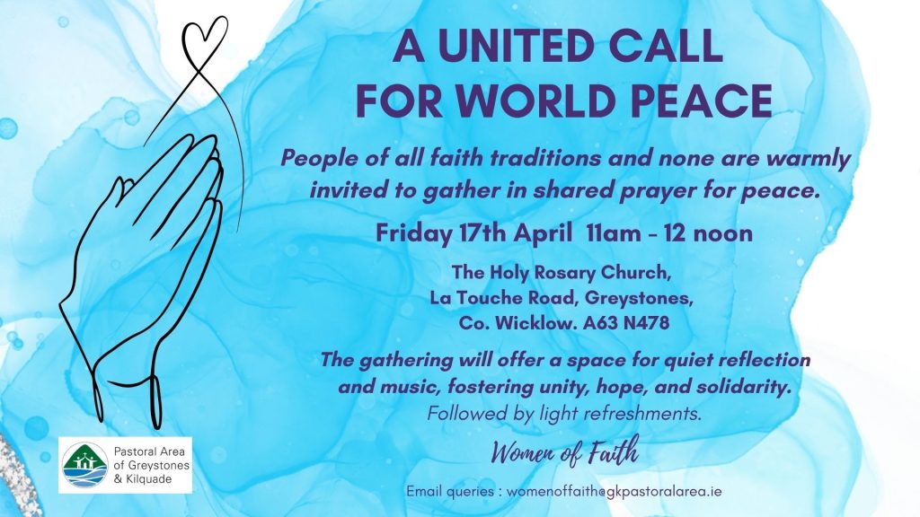 Prayer For Peace will take place on Friday, 17th April from 11am – 12 noon in the Holy Rosary Church, Greystones.