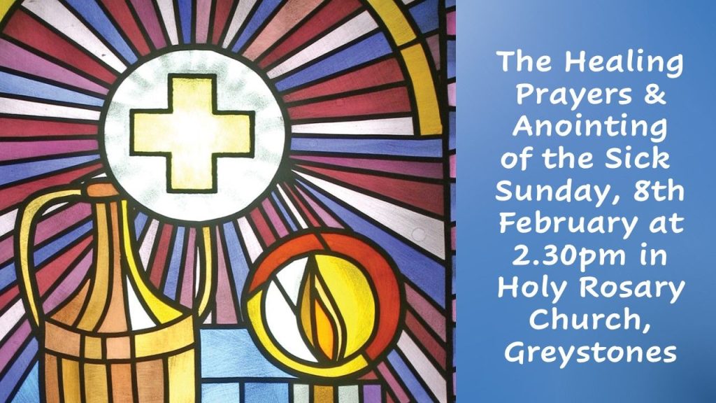 On Sunday 8th February at 2.30pm in The Holy Rosary Church, Greystones, you are invited to Prayers of Healing with the Anointing of the Sick. See the Prayer to mark World Day of the Sick.