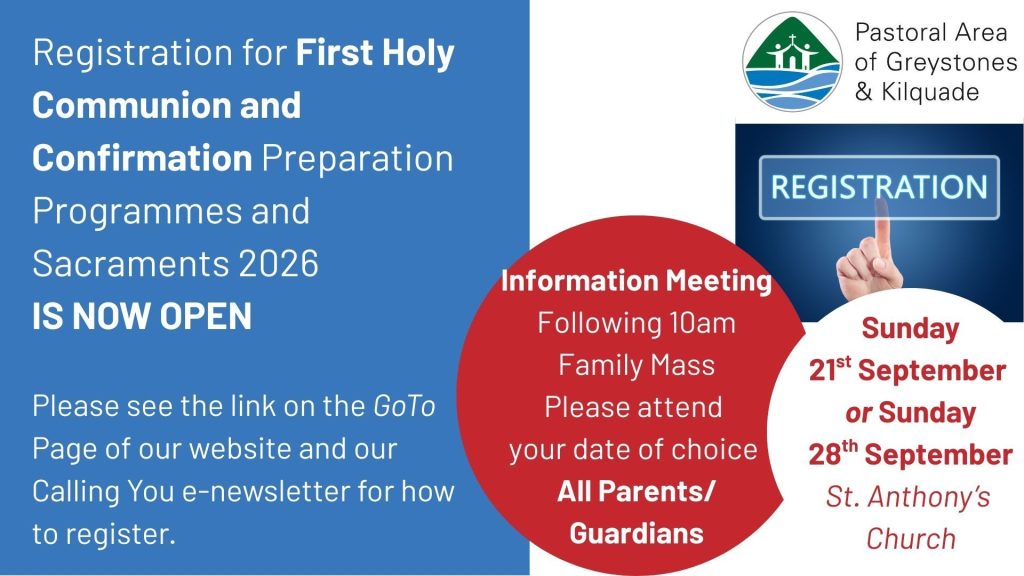 We are delighted to announce that Registration for the 2025-2026 First Holy Communion and Confirmation Preparation Programme and Sacraments is now open.