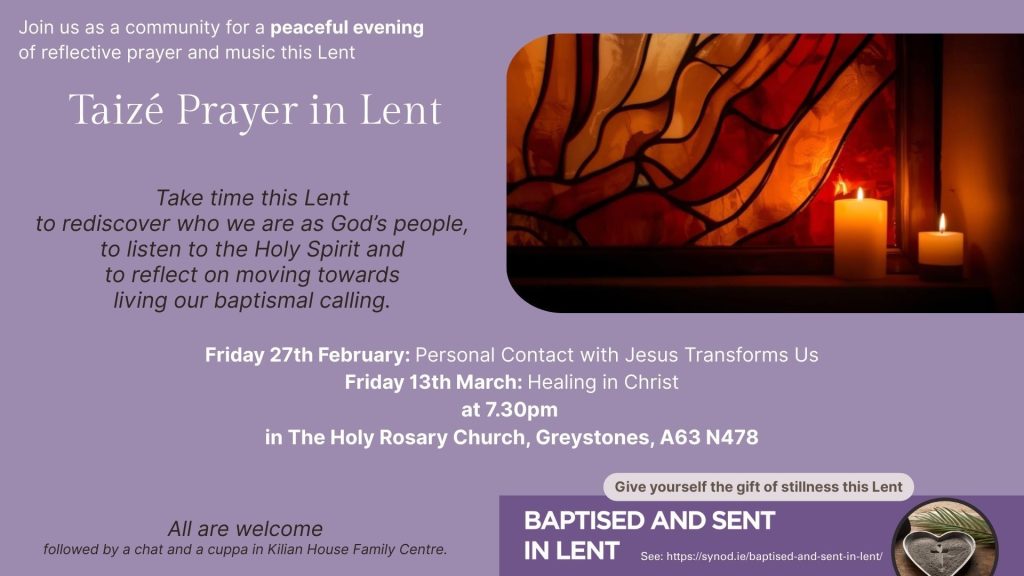Join us for a peaceful evening of reflective Taize prayer and music on Friday February 27th and Friday March 13th 2026 at 7.30pm in The Holy Rosary Church, Greystones, A63 N478, followed by a chat and cuppa in Kilian house Family Centre.