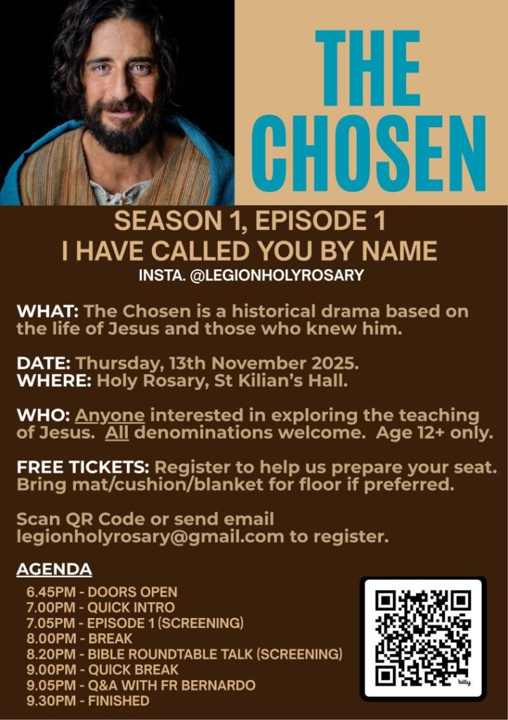 All denominations welcome. A 12+ event. Please bring a cushion or mat for comfort. Free event but please register by scanning the QR code on the poster below or sending an email to legionholyrosary@gmail.com.
