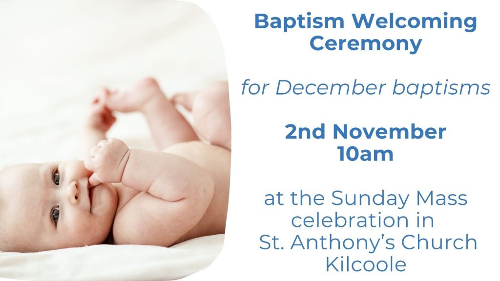 The next ceremony, as part of the preparation for babies being baptised in December, will take place on Sunday the 2nd of November at the 10am Family Mass in St. Anthony’s Church, Kilcoole.