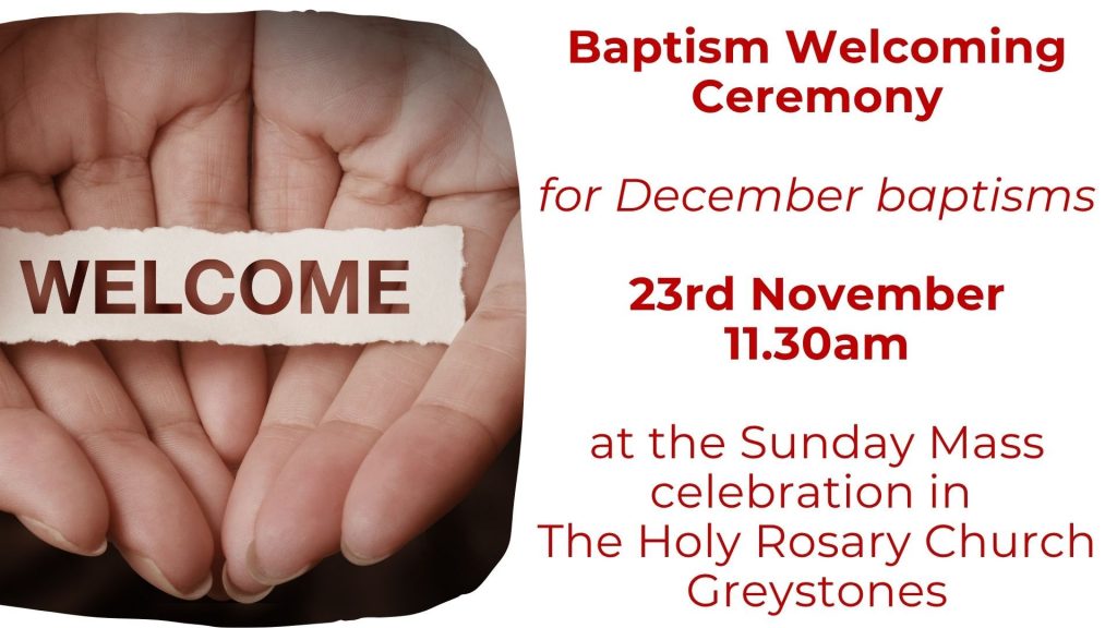 The next ceremony, as part of the preparation for babies being baptised in December, will take place on Sunday the 23rd of November at the 11.30am Mass in the Holy Rosary Church, Greystones.
